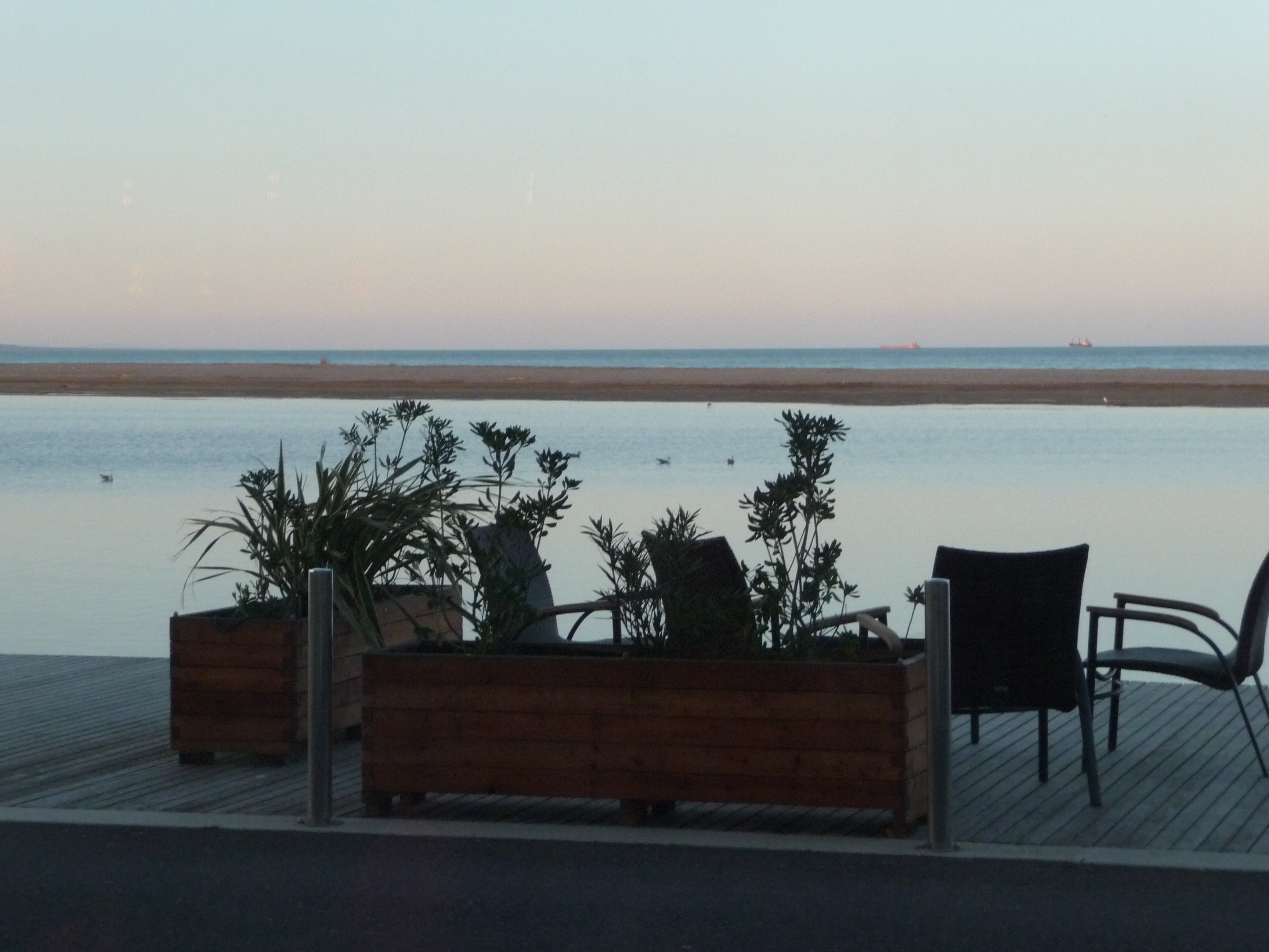 Dîner au resto avec la vue sur l’étang et la mer au fond…