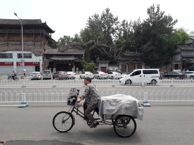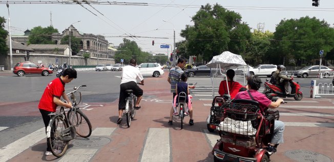 Sacrée balade de 35 km dans Pékin ! Cela nous a permis de comprendre comment tout ce traffic de vélos, scooters électriques, motos, carioles en tout genre et bien sûr bus et voitures font pour ne pas se télescoper plus souvent…Les chinois anticipent, sont attentifs, adroits et surtout ne se plaignent pas de la mauvaise conduite des autres…