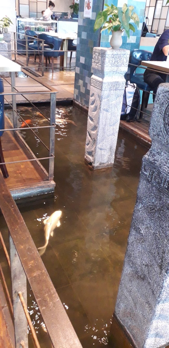 A midi arrêt dans un restaurant cantonais où des gros poissons rouges barbotaient dans un bassin creusé dans le plancher. Étrange…