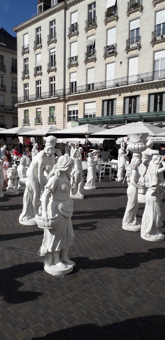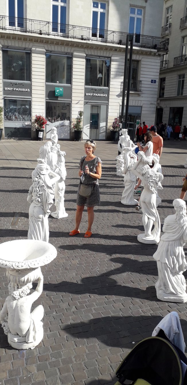 Hier nous avons passé la soirée à Nantes où il y avait plein d’expos dans le cadre du ‘voyage à Nantes’. La place Royale est impressionnante couverte de statues. Dans le centre ville, il y a de l’émotion par rapport à l’accident malheureux survenu lors de la fête de la musique.