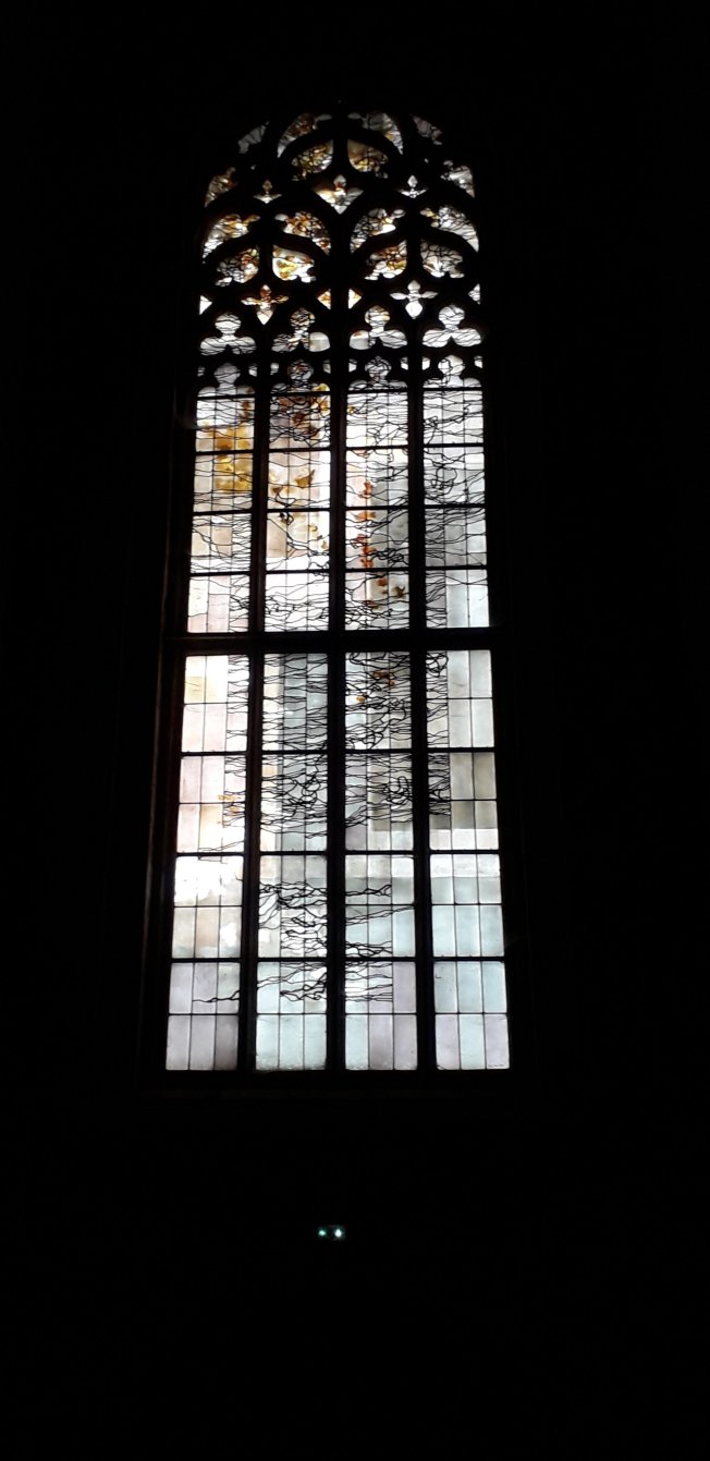 On atterrit en fin de journée dans un petit camping bien chouette : jolis emplacements et très calme. Le tout à côté d’une église avec des vitraux modernes.