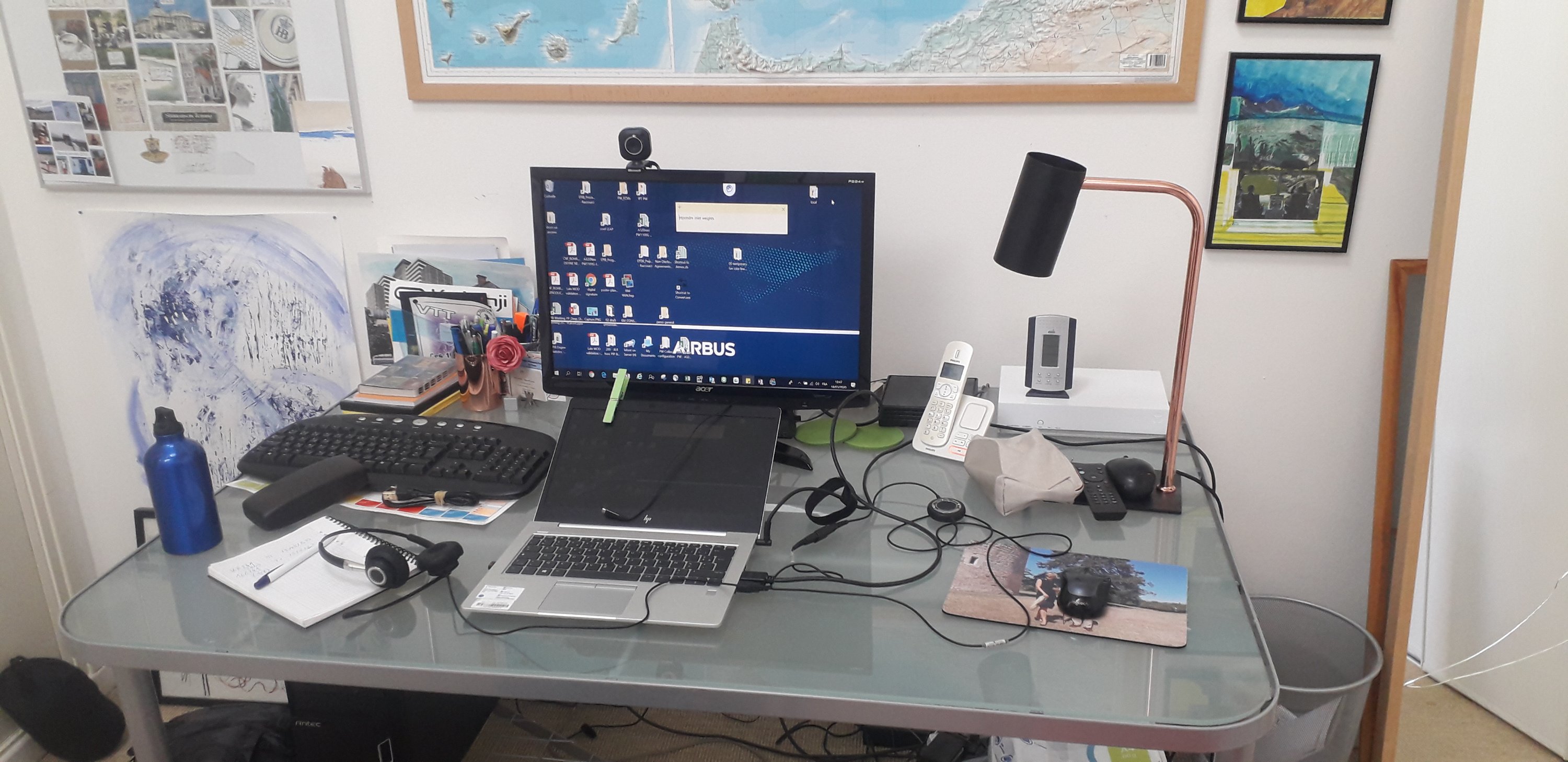 Un petit aperçu de l’installation au bureau : la pince à linge c’est pour permettre au téléphone mobile de rester droit quand je le pose sur l’écran du PC (pas mal de discussions et d’échanges écrits se font sur ces petites machines : plus simples et plus efficaces que les PCs…incroyable…)