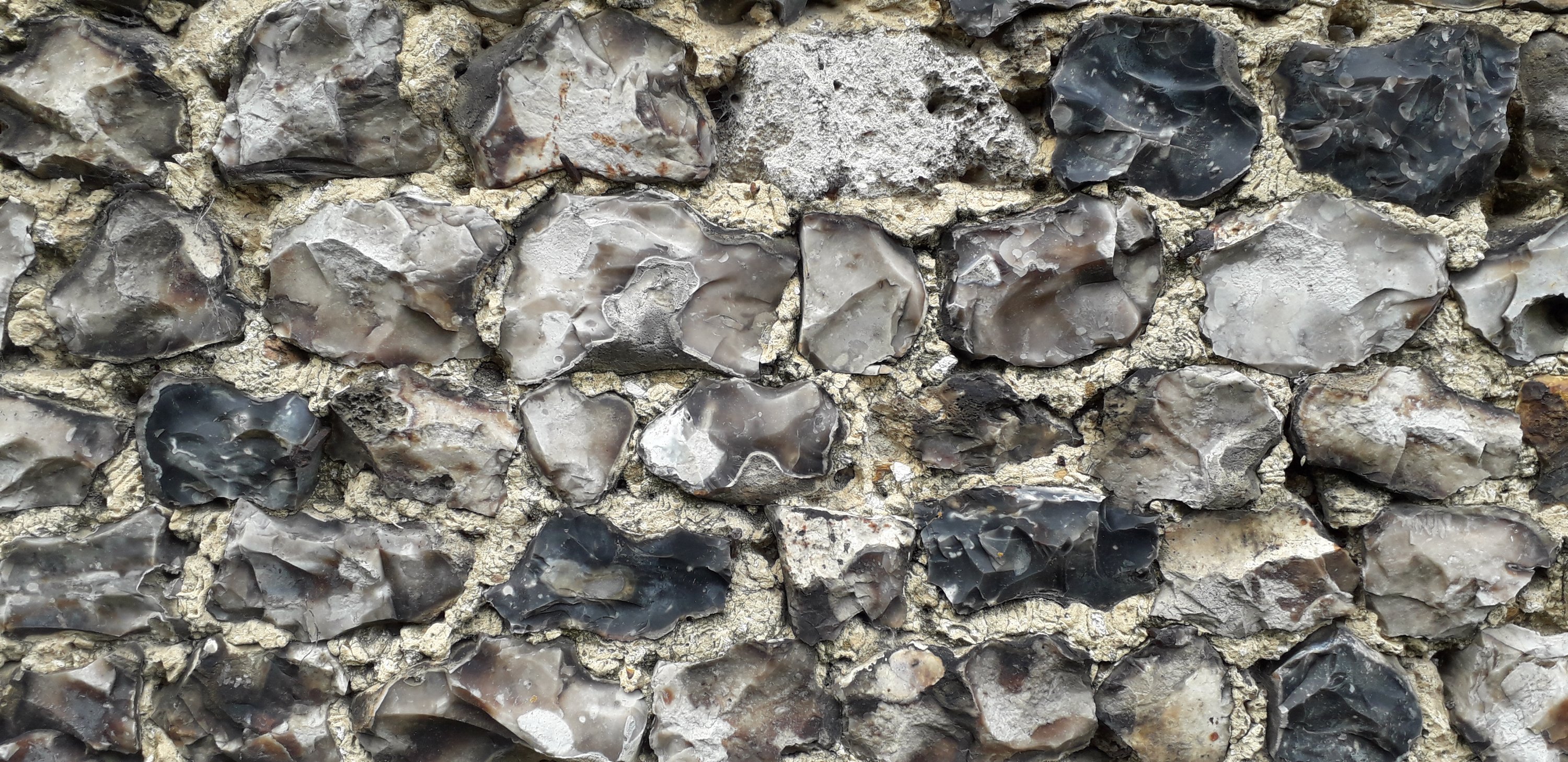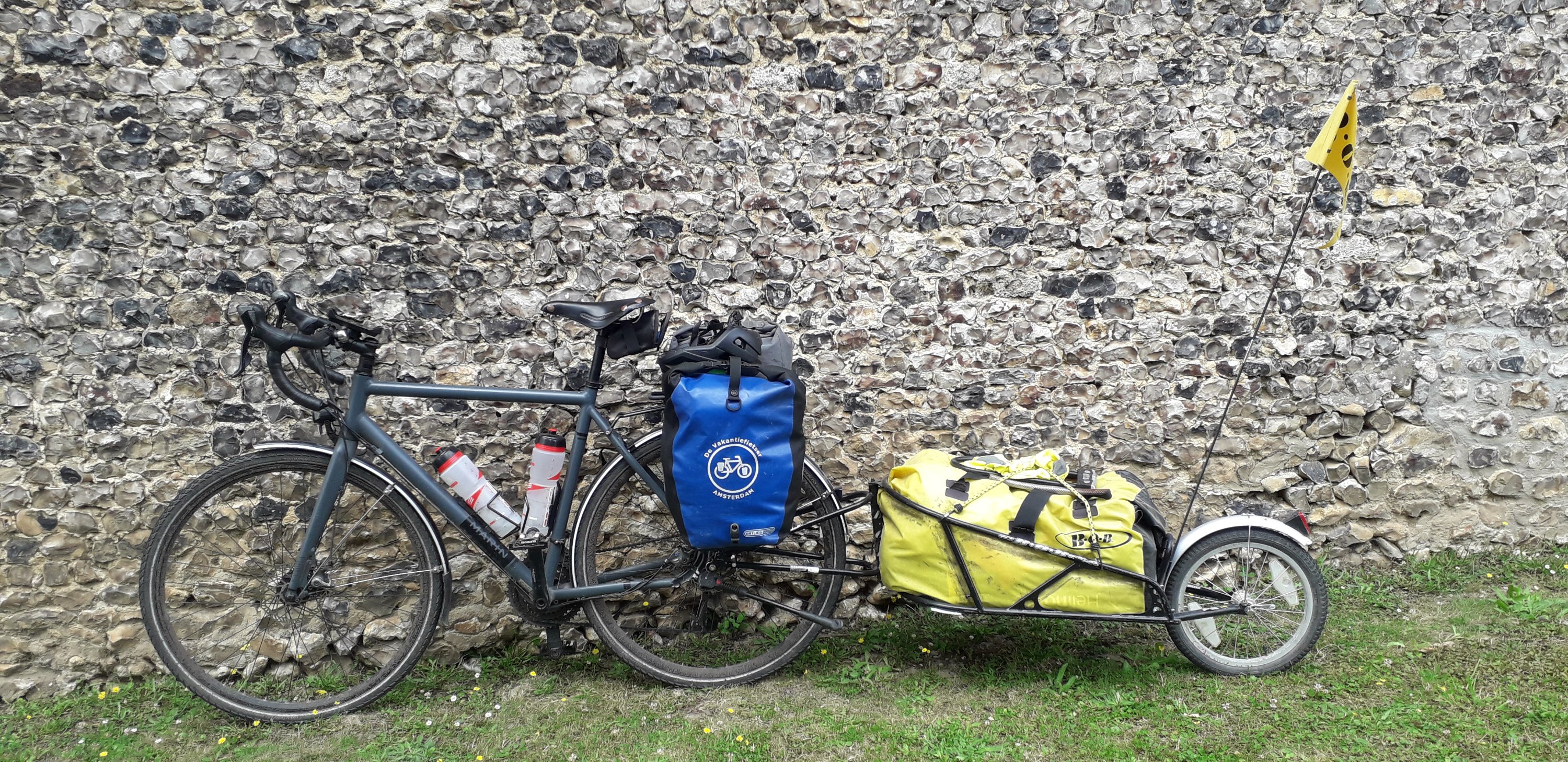 A l’arrêt de midi, on pose nos vélos contre un mur orné de silex : étonnant mais apparemment cela se fait beaucoup dans le coin