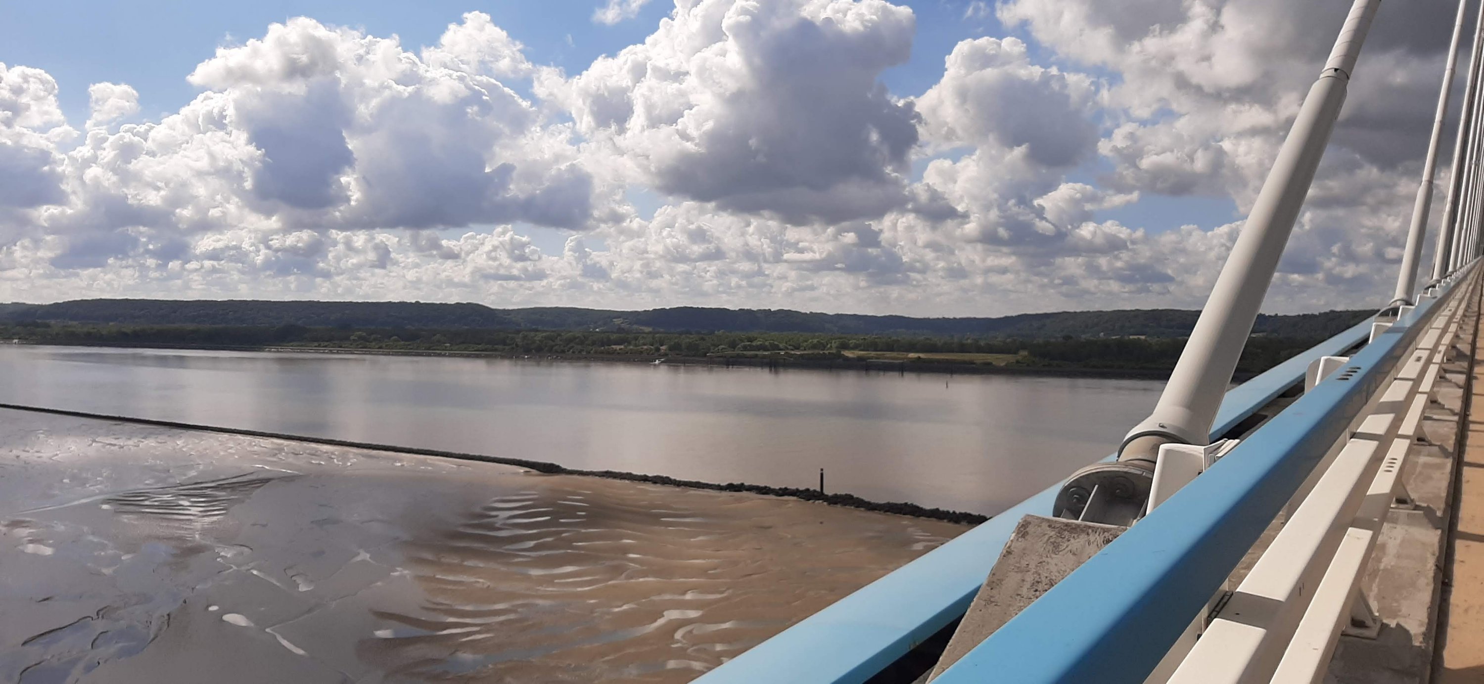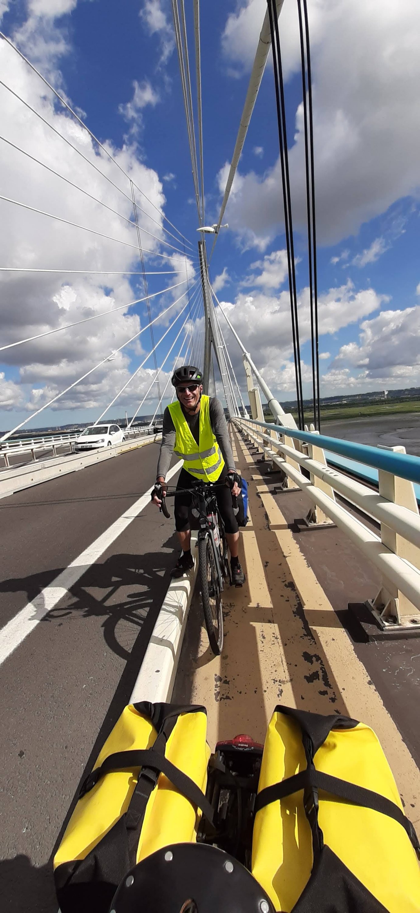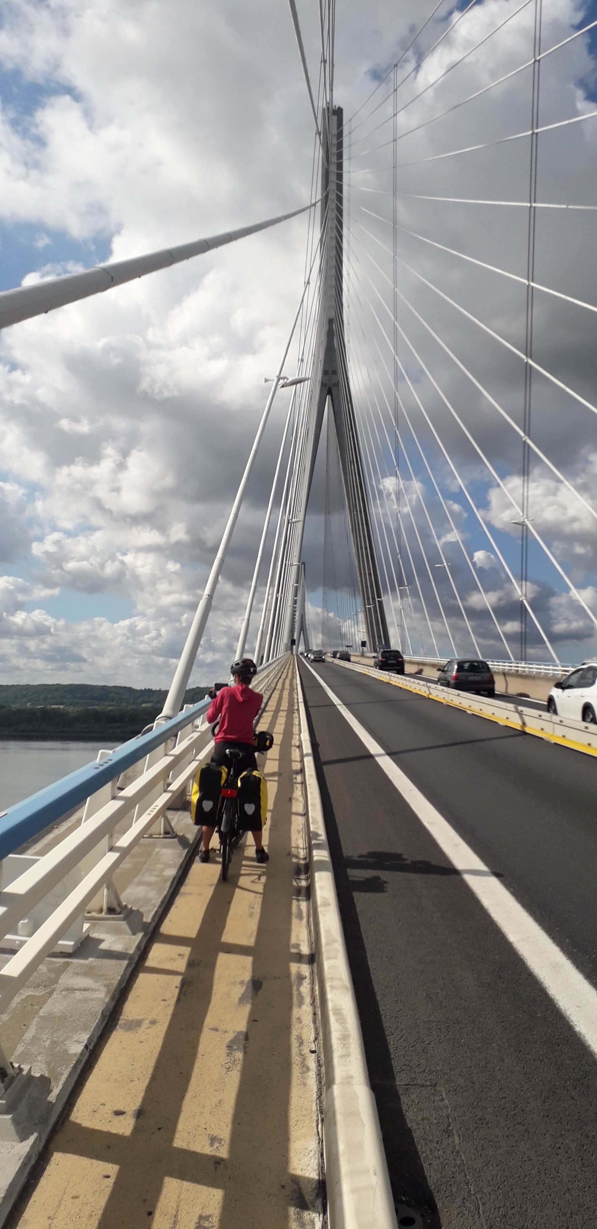 D’abord le passage du pont de Normandie : on a hésité un peu avant de se lancer car la plupart des blogs le déconseillait mais comme cela nous faisait gagner pas mal de kilomètres on s’est décidé. Finalement ça allait mais heuresement qu’il n’y avait pas de vent car cela doit être alors plus compliqué !