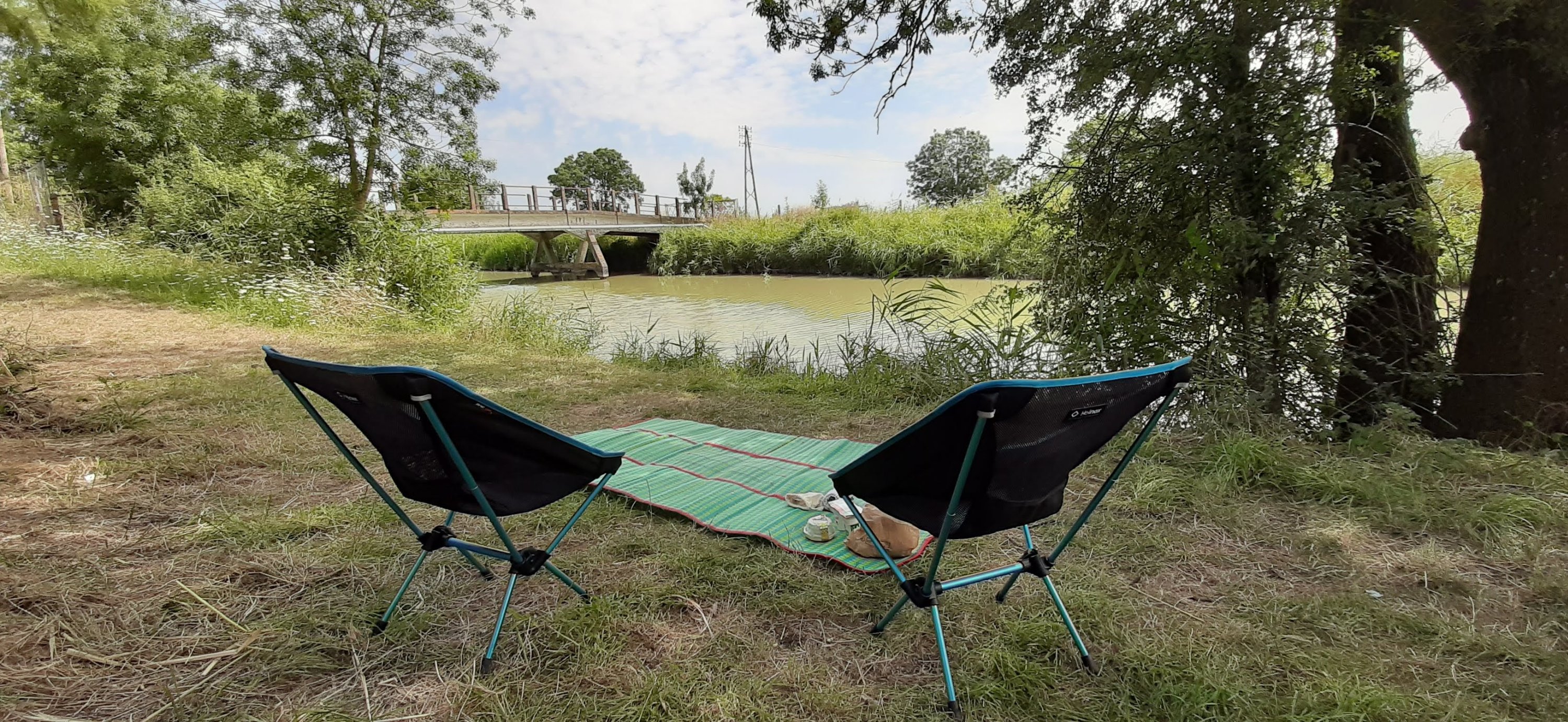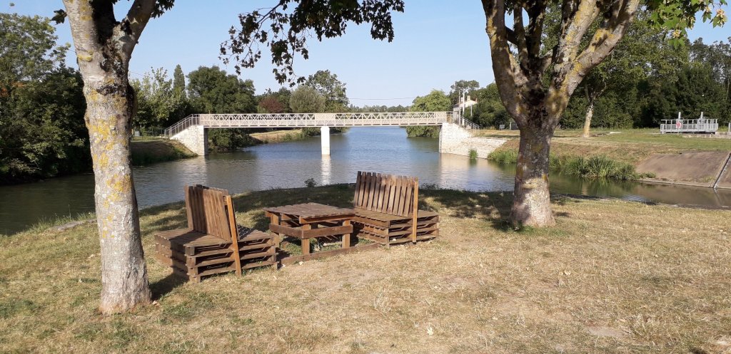 Cette fois ci, nous quittons le marais poitevin en finissant par une longue ligne droite le long d’un canal qui mène à La Rochelle depuis Marans. On croise de nouveau plusieurs des cyclos campeurs que l’on a vu les jours précédents (dont Eric qui avance avec le même rythme que nous et qui lui continue jusqu’à Hendaye…bon voyage !). Il fait chaud à l’heure du déjeuner et les tables picnic manquent : qu’à cela ne tienne nous sortons nos sièges et nous avons une installation idéale.