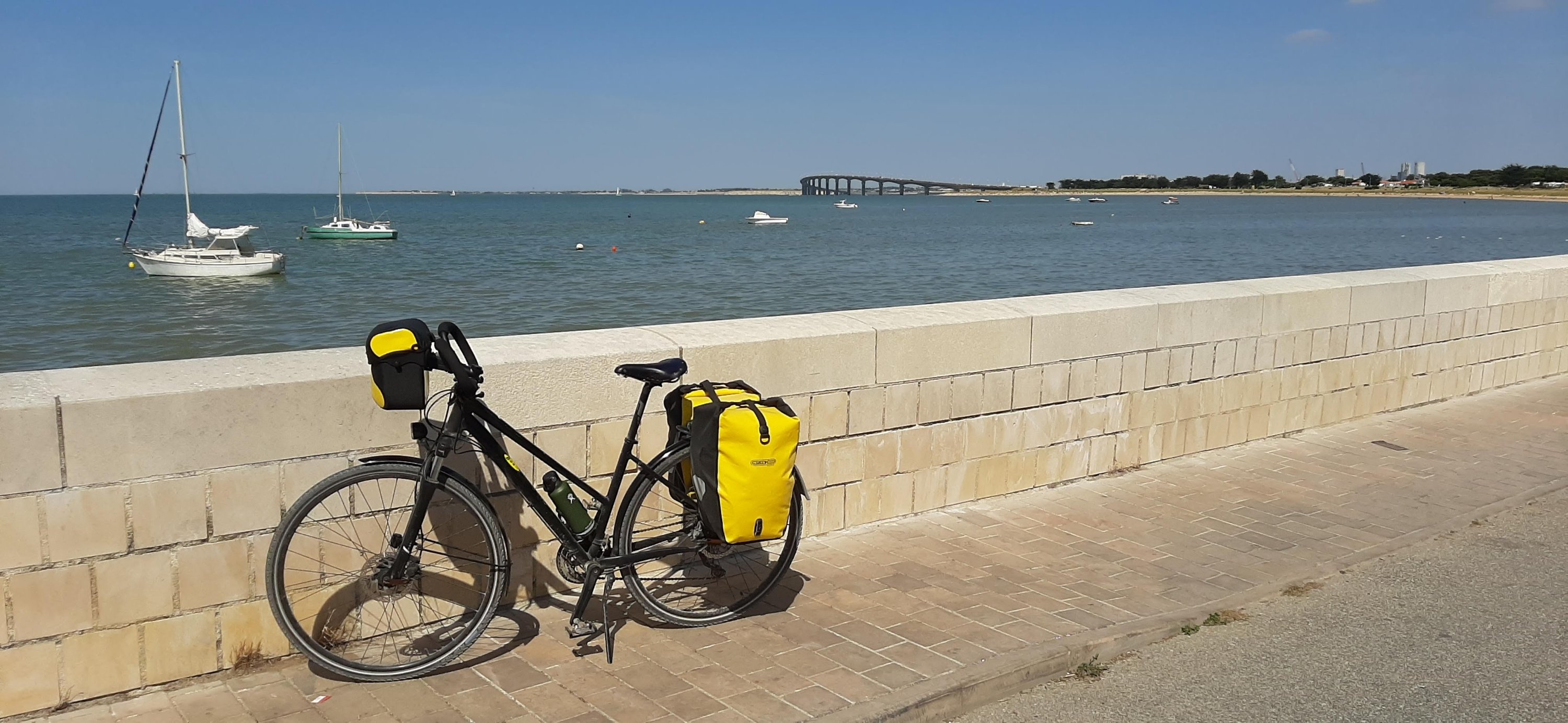 On s’embarque ensuite pour la traversée du pont de l’ile de Re : il est beaucoup mieux organisé pour les vélos et moins raide que le pont de Normandie au Havre. Nos amis sont à La Couarde à l’autre bout de l’île il faut donc finir contre le vent…dur dur.