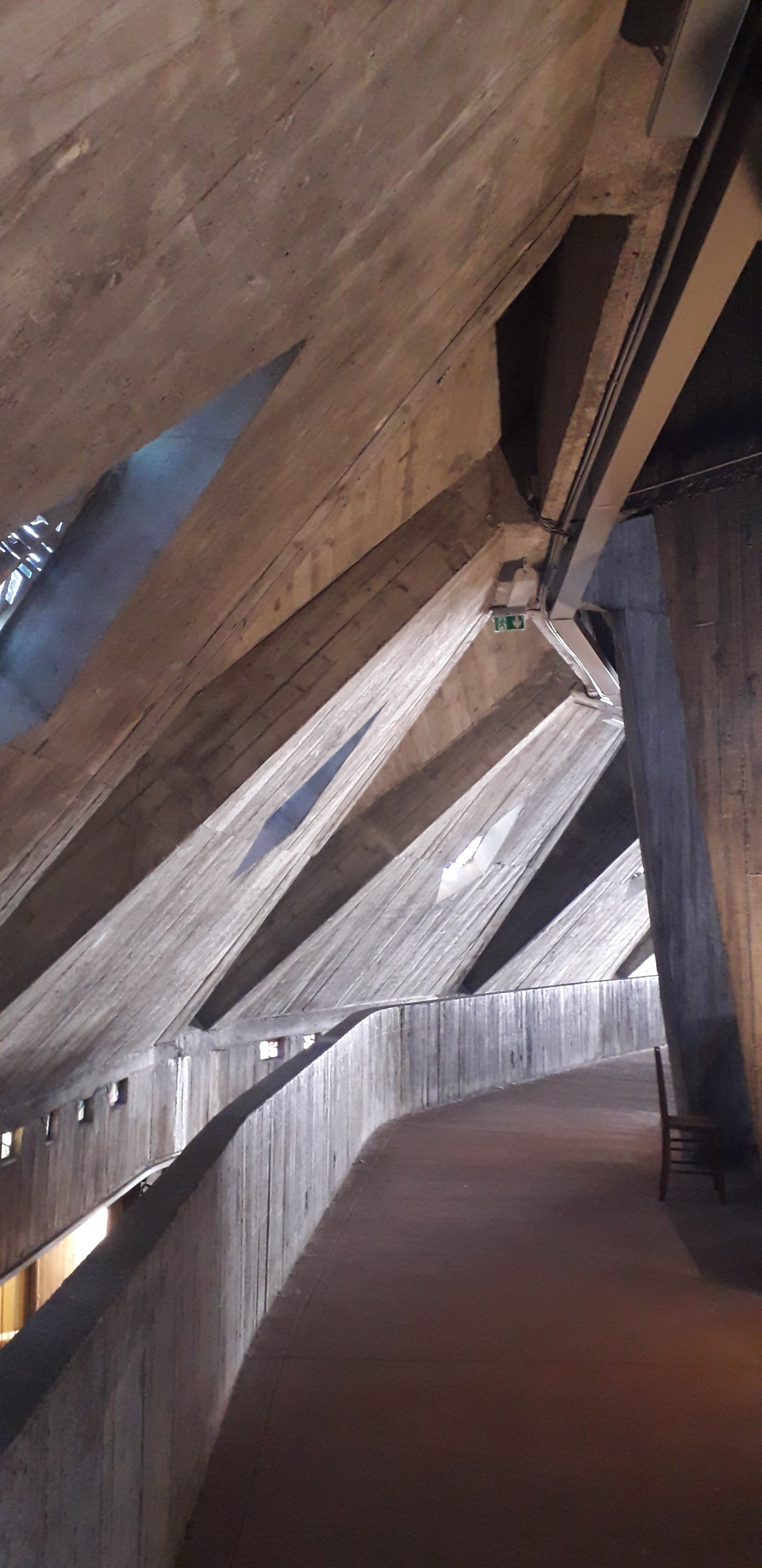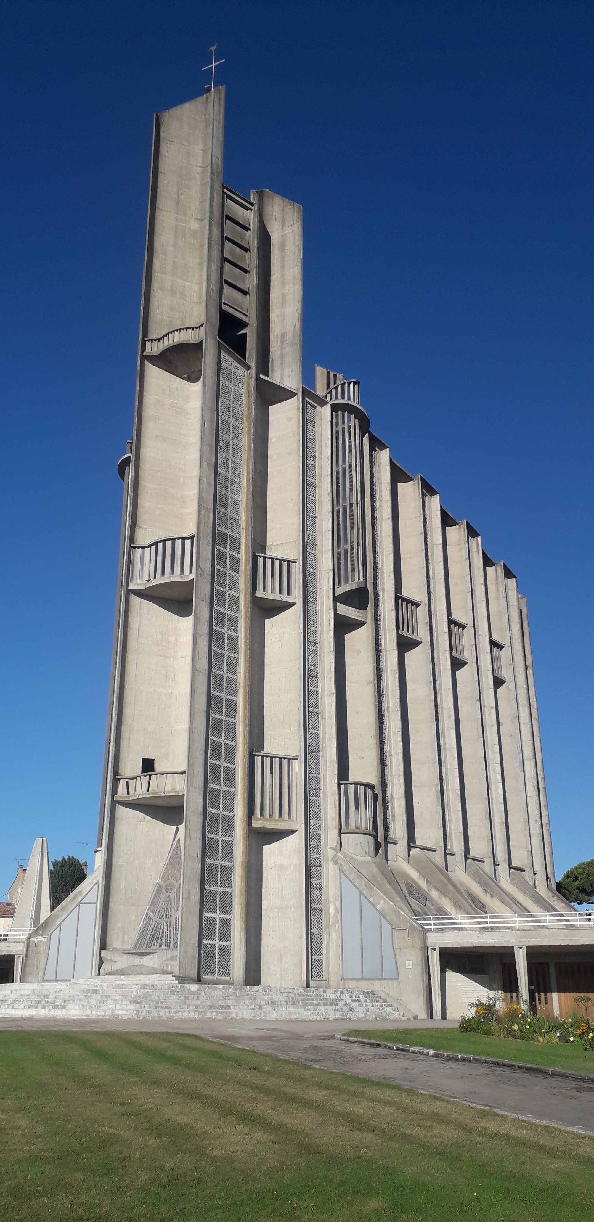 Sur les conseils de Félix, on visite ce matin la cathédrale de Royan : tout en béton, datant de la reconstruction (en effet comme Le Havre, Royan a été détruit au moment de la libération à la fin de la seconde guerre mondiale). On est pas déçu : impressionnante de l’extérieur et surtout très intéressante de l’intérieur avec une rochelle qui permet d’apprécier sa taille et les vitraux.