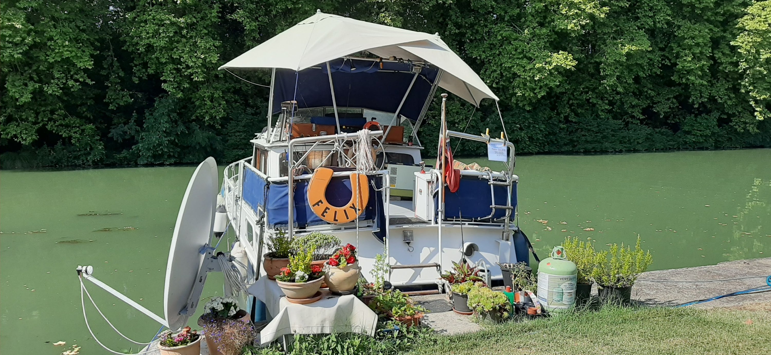 Joli stop café apéro quand même à la bifurcation canal du midi / Baïse. Ils utilisent un robot électrique pour obtenir une pelouse tondue à l’anglaise.