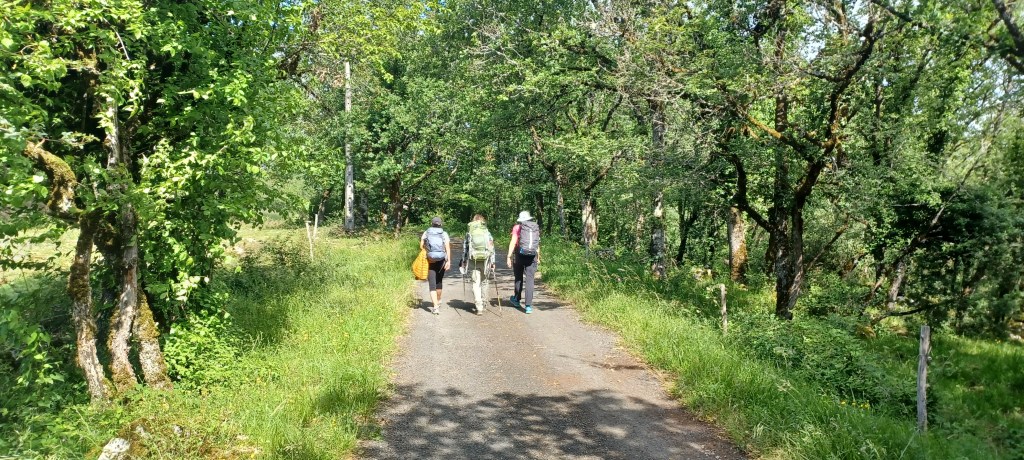 L’étape d’aujourd’hui est longue (la plus longue du circuit) mais plutôt facile sans trop de dénivelé et les chemins sont larges sans herbes hautes cette fois…Pour midi on cherche l’ombre et on utilise les chaises de l’église.