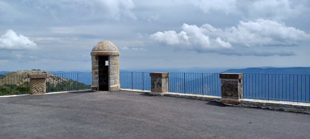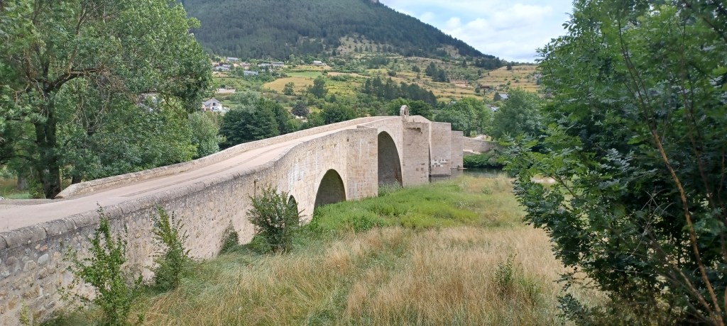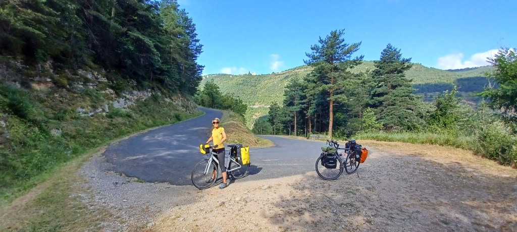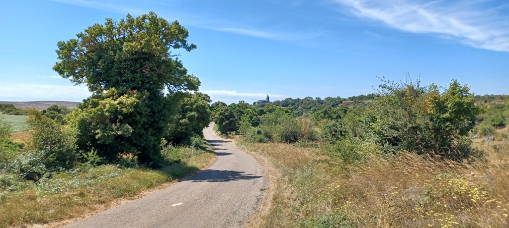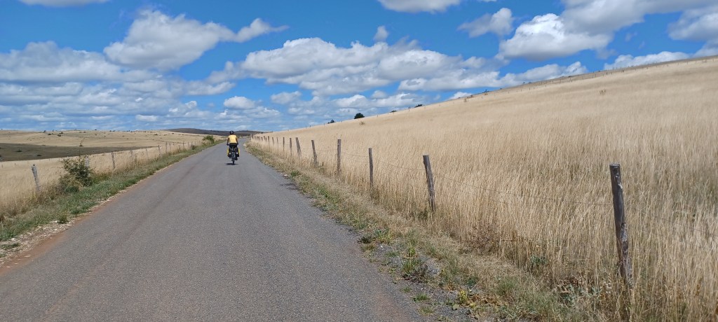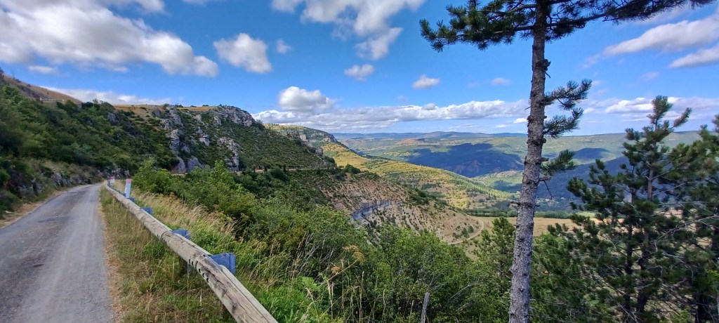 On galère un peu pour trouver des recharhes de gaz (à quand un standard européen bien distribué dans toutes les petites villes ?) et on repart pour aller dormir sur le causse de Blandas (600m d’altitude : il y fera meilleur). La montée est courte mais avec la chaleur c’est quand même technique.
