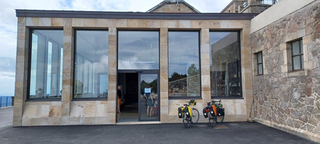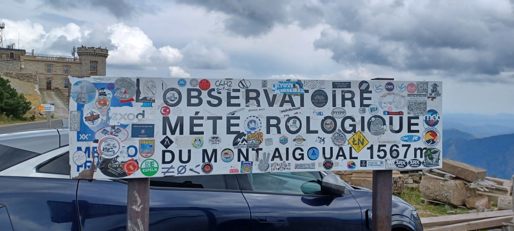 Aujourd’hui le programme c’est la montée au Mont Aigoual : c’est assez rare de pouvoir monter à un sommet en vélo donc on en profite. Cela commence soft mais au milieu de la montée il y a quelques pentes raides…On arrive au sommet où se trouve l’observatoire meteo et on profite du restaurant en terrasse avec une vue large sur les alentours.