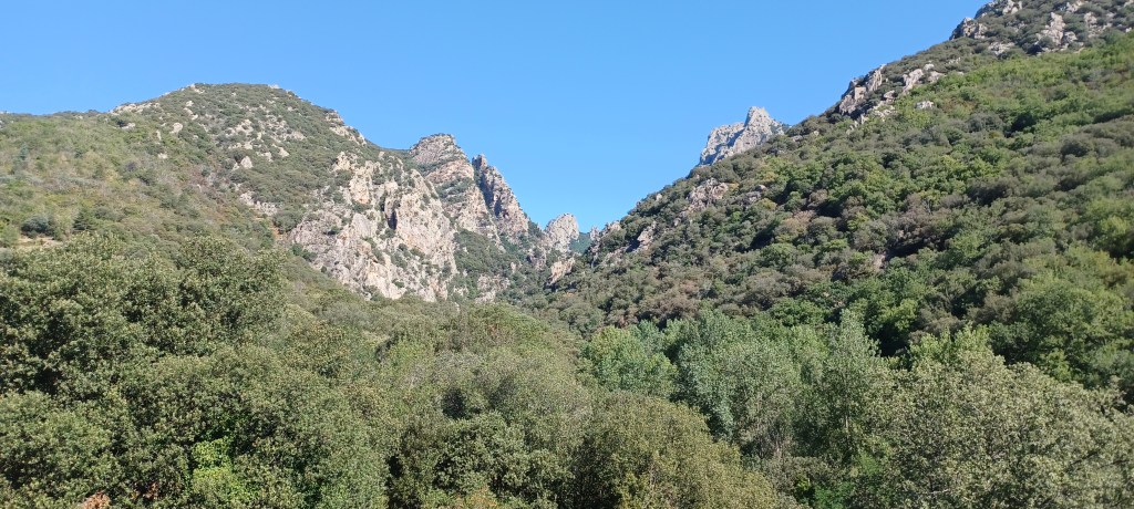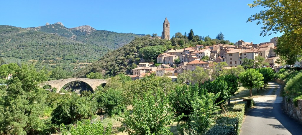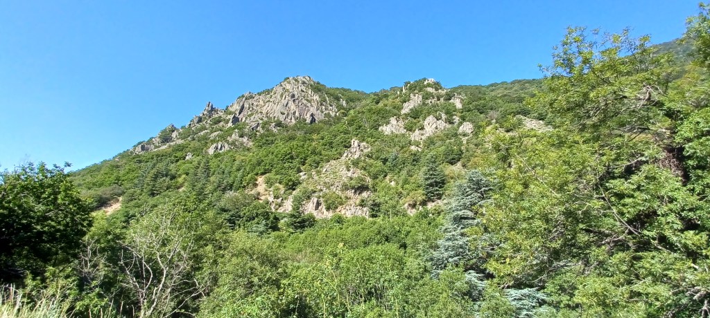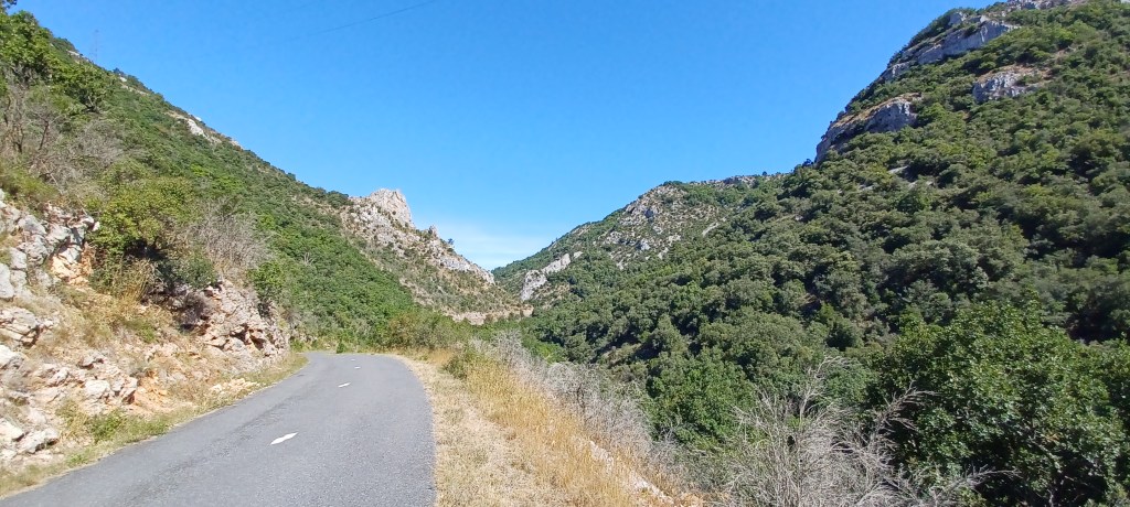 Il y a de beaux points de vue sur le massif du Caroux et le débit des gorges d’Heric ce matin et le paysage change du tout au tout lorsque l’on bascule du côté Mazamet et Montagne noire : beaucoup plus vert et des arbres plus grand : au revoir le climat méditerranéen !