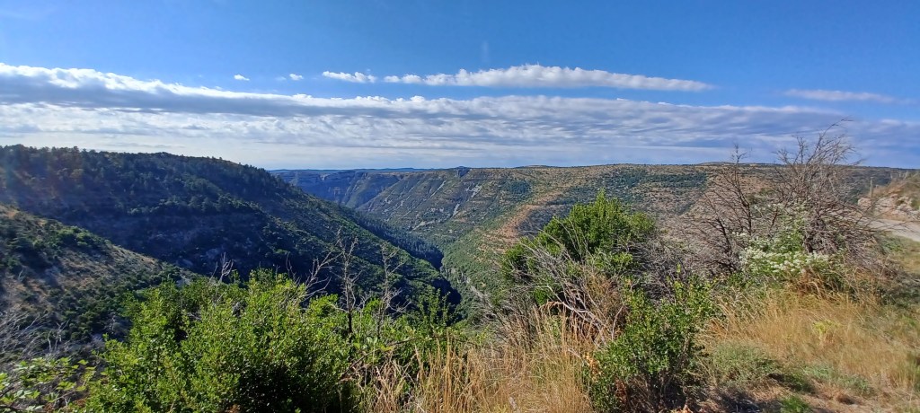 On commence par monter du Tarn vers ce fameux causse Mejean qui est un peu comme une île prise entre les gorges du Tarn et de la Jonte. Une petite route avec des lacets en pente constante et forte…