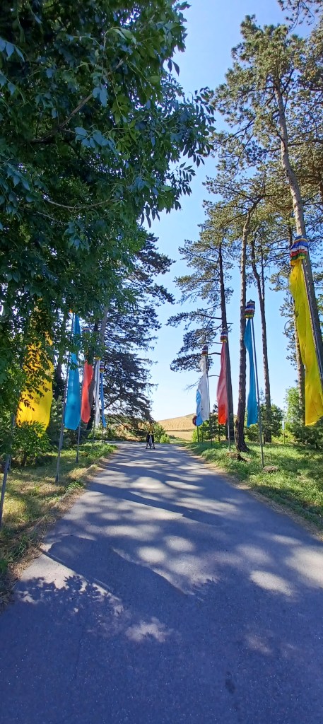 En quittant La Couvertoirade, on passe devant un temple bouddhiste : on le voit de loin seulement car il est utilisé ce matin. Curieux mais pas complètement surprenant car le plateau du Larzac appelle à la méditation !