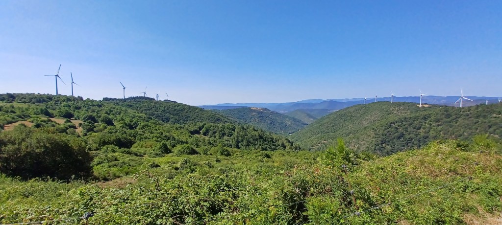 Il y a pas mal d’éoliennes sur les crêtes et aujourd’hui il y a du vent elles tournent. Et puis c’est la plongée sur Lunas : encore une très jolie descente !!! Les cigales reviennent et la chaleur aussi !