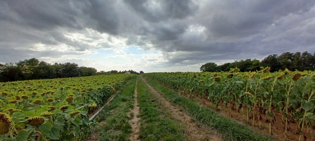 On quitte la rigole pour rejoindre le camping ; il se fait tard et les jambes commencent à fatiguer…C’est à ce moment que Komoot (notre GPS favori) nous fait prendre une montée en terre au bord d’un champ…Hésitation car par la route cela rajoute quelques kilomètres…allez on part donc en poussant et petit à petit le chemin s’aplatit et s’améliore ; on peut remonter sur le vélo et arriver just in time au camping. Il est au niveau du lac de la Ganguise mais côté Avignonet Lauragais. Il est sur une hauteur avec une très belle vue mais bien sûr venté : heureusement on se trouve un emplacement derrière une haie bien protégé. Prêt pour notre dernière nuit en camping du voyage 🙂